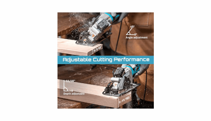 Adjustable depth and bevel:Adjustable depth (1-11/16\" at 90°) and 0-45° bevel capacity for angled cuts, you can freely adjust the cutting according to your needs. The maximum cutting depth at 90 degrees is 1-11/16\", and the bevel cutting capacity at 45 degrees is 1-1/8\"