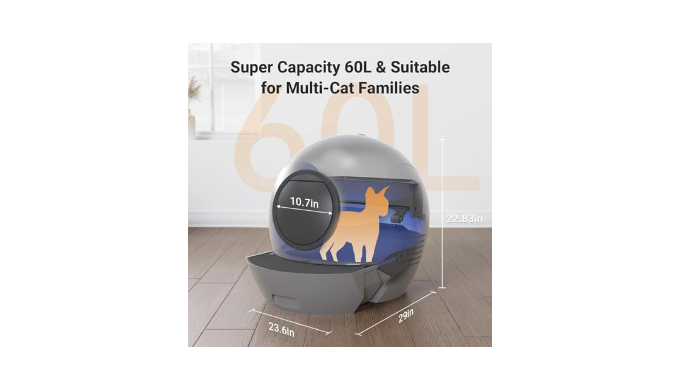 AUTOMATIC & TIMED CLEANING: Self-cleaning litter box adopts an App (Only 2.4ghz) remote, clumping and separating cat excrement from clean cat litter automatically, tracking cat usage time & trash volume. 60L extra large auto cat litter box offers a comfortable space for multiple cats from 3.3lbs to 25lbs, which can solve your worries of short-distance 7-15days travel.