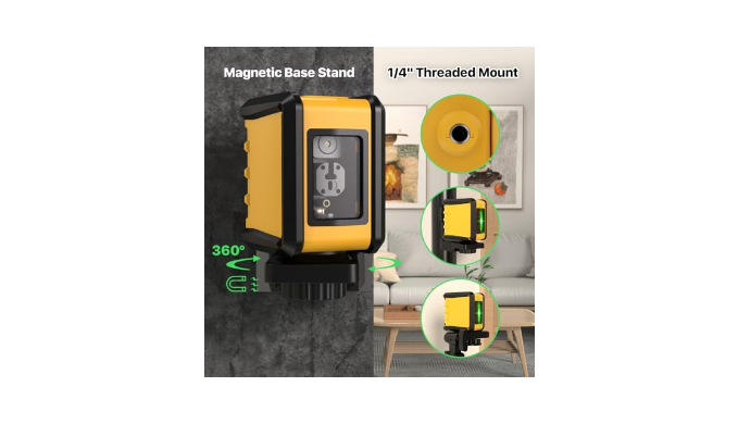 【Magnetic Bracket & 1/4\" Mount Thread】The level tool with 1/4\" mount thread, which can be attached to tripod or other mounting bases for convenient positioning. The included magnetic L-shaped bracket can be affixed to most metal surface and supports 360-degree rotation to project laser line in any position. The laser level line tool is covered with TPR soft rubber all around, making it more resistant to wear and tear, drops and shocks