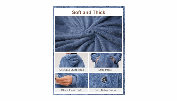 【Plus Size & Stylish】 This oversized wearable fleece hoodie (53.5\"×27.6\") offers full coverage with an extra cozy design. It features a large fleece hood, kangaroo pocket (fits phones, remotes, snacks), extra-wide sleeves, and a high-low hem for personality. Feeling like a cloud hug,Our heated hooded blanket is suitable for adults, teens, women, and men.