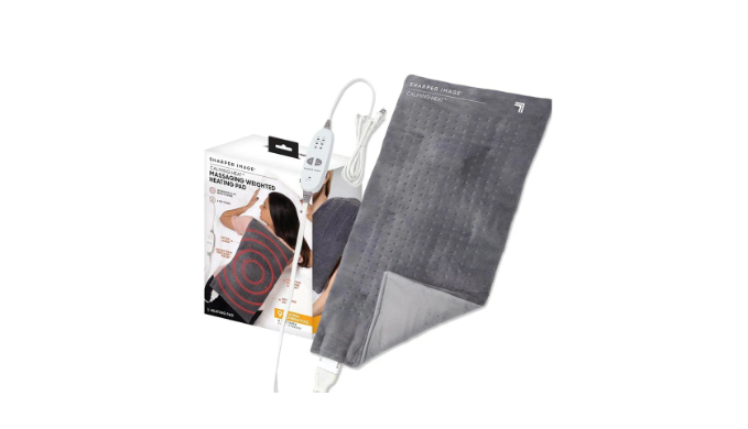 Bring soothing relief to joints and muscles with this weighted heating pad. The clever design of the Calming Heat Massaging Weighted Heating Pad ensures the pad stays exactly where you need it to while weighing only 4 pounds. Wide enough to be used anywhere on the body, this heating pad allows you to target large areas such as the back or thighs. The Calming Heat heating pad is made from luxurious velveteen material that\'s soft against the skin, whether you are using it on your legs, neck, knees or shoulders. In addition to heat therapy, the pad also offers the option of vibrating massage. The gentle vibrations complement the heat therapy for deep-penetrating relief that soothes aches and pains. Thanks to three heat settings and nine vibration levels, this pad gives you 27 possible combinations for customizing your experience. The 9-foot extra-long power cord allows you to use the pad in a wide variety of places, such as your couch, bed or office chair. This pad also features a 2-hour auto-shutoff for its heating element and a 15-minute auto-shutoff for its massage function.