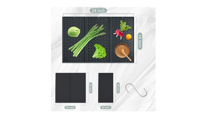【USER EXPERIENCE】- The foldable Silicone Dish Drying Mat with a practical hook, this dish drainer mat can be easily hung up to dry or stored, keeping your kitchen neat and organized.The anti-slip design on the bottom effectively prevents sliding.