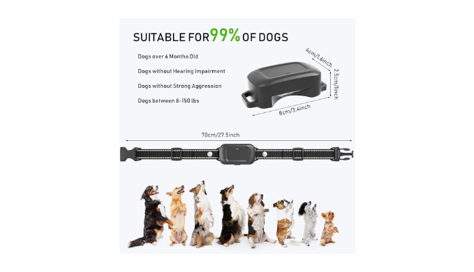 Usage Guideline — This stop bark collar is recommended for dogs over 6 months old、 8-150lbs、 non-hearing impaired and not strongly aggressive. When wearing, please be careful to keep the side of the collar with the microphone on it facing up. If you have any questions and suggestions, please feel free to contact us!