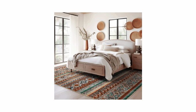 - BOHO Area Rug: Ethnic geometric design with vibrant red and green accents brings a lively, artistic bohemian feel and a bold focal point to any room.