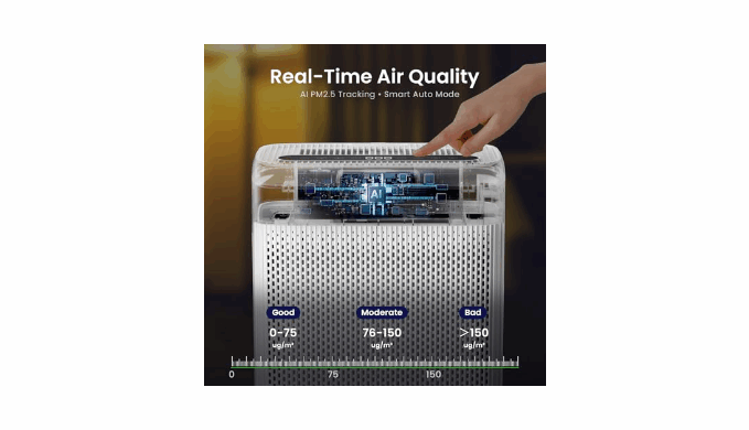 SMART REAL TIME AIR QUALITY MONITOR: Air purifier features a PM2.5 sensor, instantly display air quality data in real time. Engineered with a sophisticated, profile (just 16.14\\\" high), our hepa filter air purifiers combines gallery-worthy design with powerful performance, effortlessly monitor, adapt, and maintain fresh air. Blending seamlessly as chic home decor for living rooms, modern offices or nursery spaces.