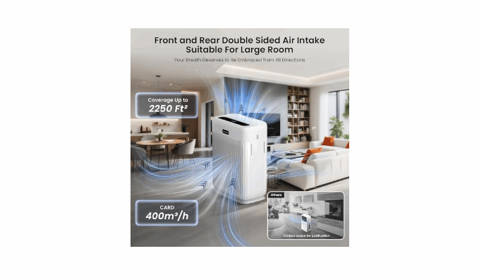 EFFICIENT CIRCULATION PERFORMANCE: Experience optimized airflow with Hearbobo\\\'s HEPA air purifiers for home, designed to effectively cover spaces up to 2,250 sq.ft. The large air purifier 360° Vortex Airflow technology promotes continuous air refreshment throughout large rooms, working seamlessly in bedrooms and open floor plans.