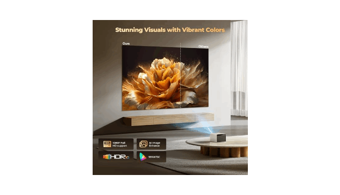 Stunning Visual Feast -HDR10+/1080P Support: Powered by the MTK9660 AI chip, this Mini Projector delivers HDR10+ technology and AI-powered picture optimization to enhance brightness in vibrant scenes while enriching depth in dark areas—producing dynamic, lifelike visuals. It smoothly delivers crisp 1080p-quality images and supports 4K decoding via HDMI. Its smart AI image enhancement achieves 98% NTSC cinema-grade color accuracy. Eye protection technology reduces blue light for comfortable viewing, even during extended sessions. This makes it an ideal home projector for movies, gaming, or nighttime outdoor use.