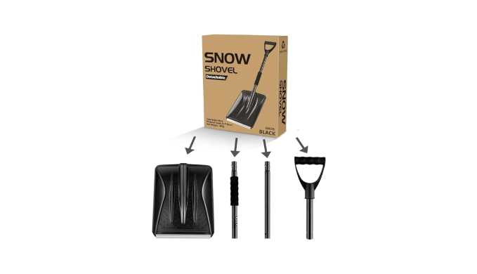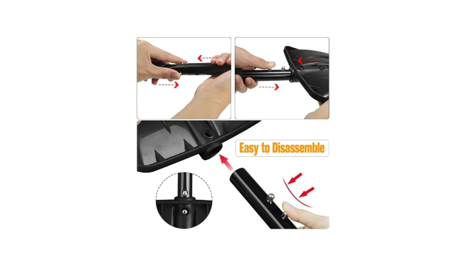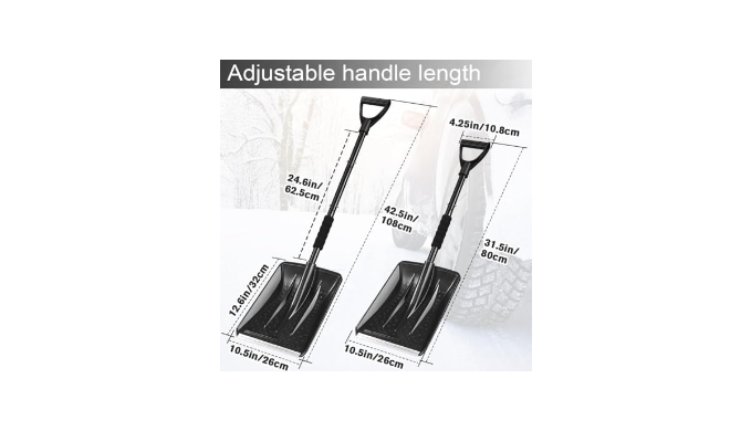 ``` Snow Shovel ``` It is easy to install and disassemble. After use, you just press the button and then turn it down to divide the snow shovel into three parts, saving space. It can be used in the car and at home;