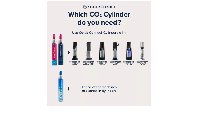 Machine is compatible with 1L and 0.5L SodaStream carbonating bottles and only compatible with pink Quick Connect CO2 Cylinder.