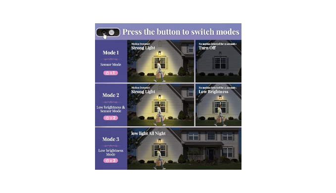 【3 Sensor Lighting Modes】 Mode 1: Press and hold for 1 second to activate Human Body Sensor mode. Mode 2: Press twice to activate human-machine interaction + low light mode. Mode 3: Press three times to activate continuous low light mode