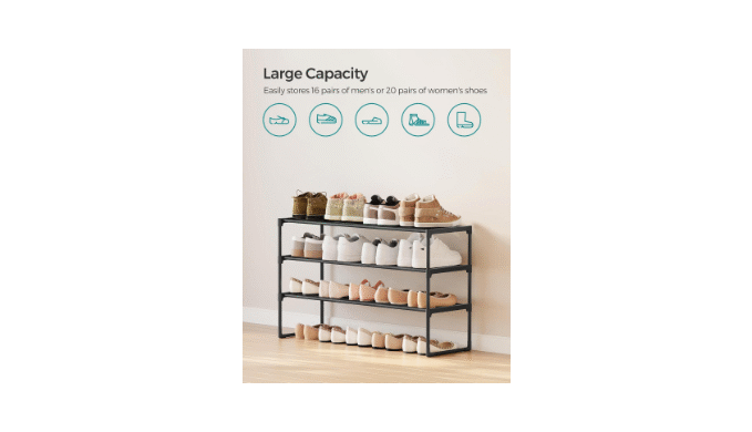 【SPACIOUS】The shelf measures 11.8\"D x 36.2\"W x 21.7\"H. When used upside down, it can accommodate up to 16 pairs of men\'s shoes or 20 pairs of women\'s shoes. With the optimal spacing between the levels, the shelf can also hold ankle boots