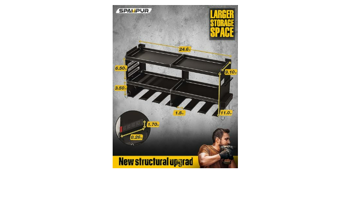【 24.5-inch large size and more storage 】 This wall-mounted tool holder features the latest high-capacity design, with a garage organizer height of 11 inches that offers more space than other tool holders, 6.3-inch mid-tier tool rack that can hold more charging stations and large power tools, and a pliers holder, drill bit storage are added to the sid