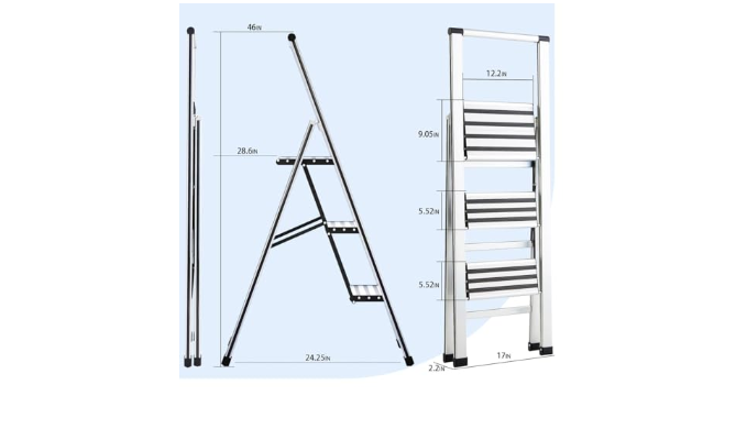 Step stool foldable size is 17L*2.2W*50H, slim step stool is easy to store, you can place him in the gap space, or hang it on the wall