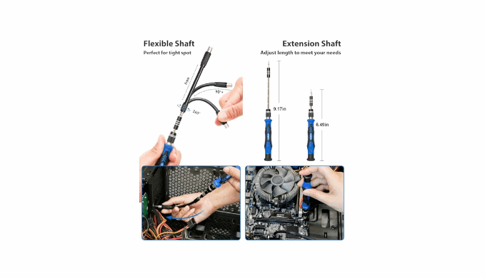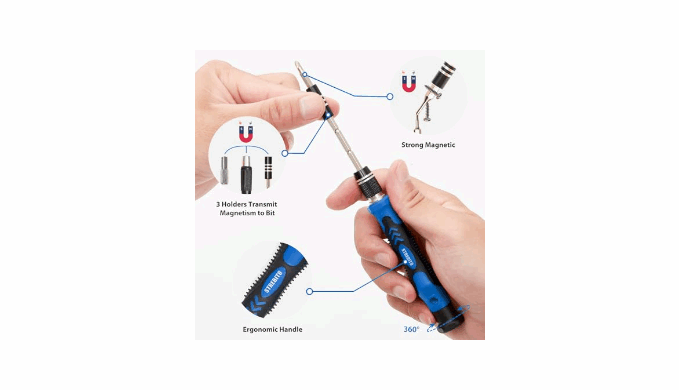 【Humanized Design】This electronic screwdriver set has been professionally designed to maximize your repair capabilities. The screwdriver features a particle grip and rubberized, ergonomic handle with swivel top, provides a comfort grip and smoothly spinning. Magnetic bit holder transmits magnetism through the screwdriver bit, helping you handle tiny screws. And flexible extension shaft is useful for removing screw in tight spots