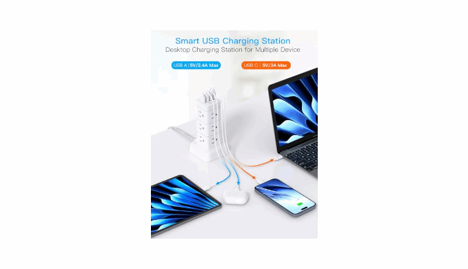 【Power Strip With USB C Ports, Charge Up to 30% Faster 】- Dual USB A ports features 2.4A, the USB C port features 3A; 2 types of USB ports can detect charged devices and deliver optimal charging speed, built-in smart technology, detecting charging devices and deliver optimal charging speed automatically, giving you more charging options; Compatible with iPhone, iPad, AirPods, iWatch, Cell Phone, Tablet, Speaker and etc.