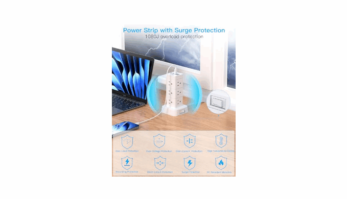 【Power Strip with Surge Protection & Overload Protection】- The surge protector tower with overload protection protects against spikes and fluctuations. The reset/off switch with integrated circuit breaker for overload protection of all outlets. This surge protector power strip has overload protection, short-circuit protection, over current protection, over-voltage protection and overheating protection. Fire-resistance PC shell with flame retardant at 1382℉ makes it more safe and longer lifetime.