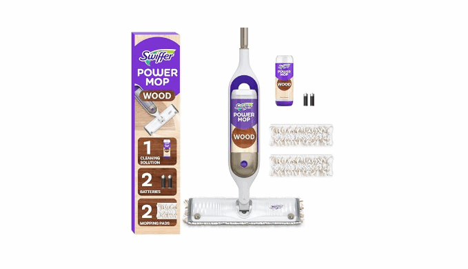 Kit Includes: PowerMop Wood Spray Mop, 2 Mop Pad Refills, 1 QuickDry Wood Floor Cleaning solution with Lemon Scent, and 2 batteries