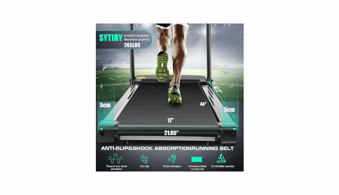 【Damping System&Hydraulic Drop Treadmill with TV 】The walking pad treadmill\'s tread surface has a sophisticated damping system for natural, joint-friendly running and protects your knees.SYTIRY treadmill is equipped with a hydraulic system that prevents damage to the floor or equipment when unfolding. The 43.3\" x 15.7\" belt area gives plenty of space, and the equipment can support up to 265 lbs.