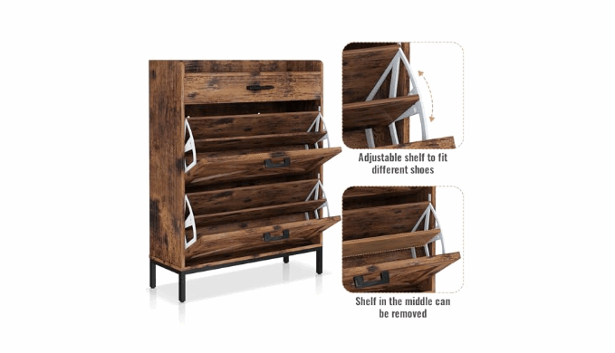 Sturdiness:This slim shoe cabinet is designed with anti-tipping device that can be fixed on the wall to prevent tipping. The adjustable feet pads on the bottom of the wooden shoe rack ensure not to scratch the floor and stays stable.