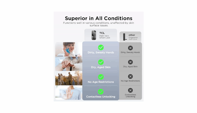 Leading Palm Vein Recognition Tech: TCL D1 Pro smart lock recognizes individuals based on unique palm vein patterns, providing the latest unlocking experience and high-security protection. In addition, all data is 100% stored locally, ensuring your privacy is never compromised.