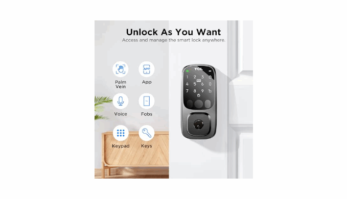 6 Unlocking Ways: TCL D1 Pro smart lock for front door provides 6 convenient unlocking methods to meet your needs anytime, including palm vein recognition unlock, app control unlock, voice control unlock, fobs unlock, keypad and keys unlock.