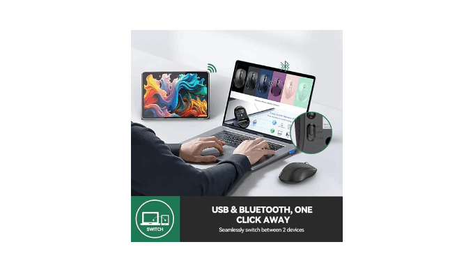 Dual-Device Control: 2 in 1(Bluetooth+2.4Ghz USB) Connection Options, use Bluetooth (Windows/macOS/Android) or 2.4GHz USB receiver. Switch between laptop/tablet instantly, macBooks require Bluetooth (no USB port). Supports control 2 devices(one with usb-a, one with bluetooth), without the trouble of plugging and pairing.