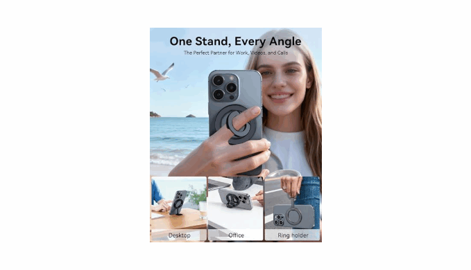 Super Strong Magnetic Ring: This MagSafe phone grip features powerful N55 ring magnets on both sides, delivering stronger magnetic force than N52. The phone-facing side supports up to 2.2 kg (equivalent to 10 iPhone 17 Pro devices), while the base magnet holds 1.3 kg—ensuring a secure grip, slip-free and drop-proof. With its strong magnets and ring stand design, you can easily lift your phone with just one finger, keeping it safe even when your hands are full.