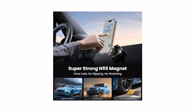 Unrivaled Magnetic Security:This vacuum suction cup phone holder incorporates a ring of 22 high-flux N55 magnets, producing a formidable 2400gf magnetic force that is 240% stronger than standard alternatives. Validated through 8,000 vibration tests and simulated harsh road conditions, it ensures your device remains securely attached. The strategically designed magnet layout actively safeguards against signal disruption, maintaining perfect call quality and GPS reliability