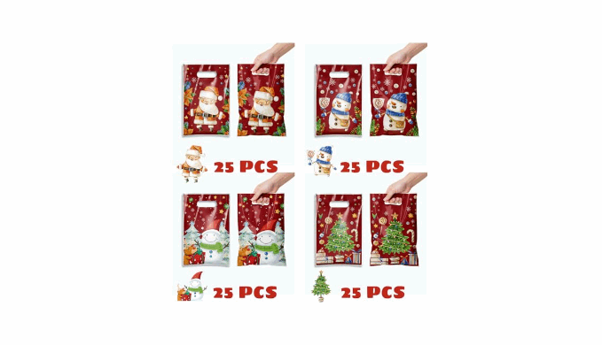 4 Festive Designs - Perfect Christmas Gift Bags: Each set of these Christmas treat bags includes 4 unique, joyful patterns (Snowman, Santa, Christmas Tree, and more), with 25 bags per design. This variety ensures you have the perfect Christmas gift bags for every guest, gift, and goodie at your party.