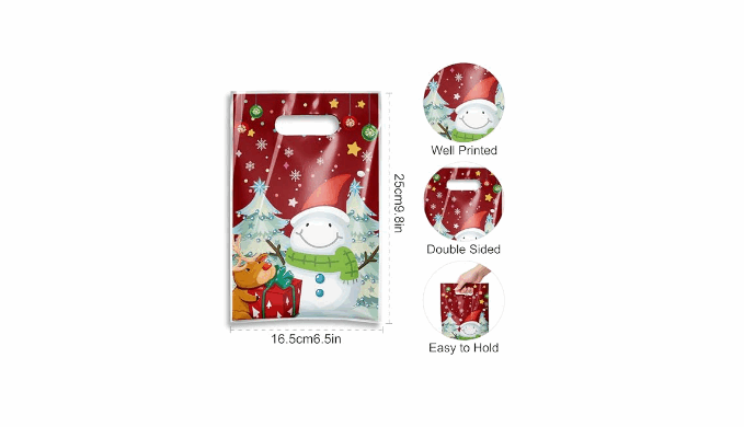 Perfectly Sized with Easy-Carry Handles: These Christmas gift bags are designed for convenience and capacity. Generously sized at 9.8\" x 6.5\" (25 x 16.5 cm), they offer ample space for gifts, snacks, and holiday confections. The integrated, sturdy handles make these Christmas treat bags a breeze to carry, ensuring a superior experience whether used for party favors or gift-giving. This practical combination of size and handle design makes them the ideal choice for all your festive needs.
