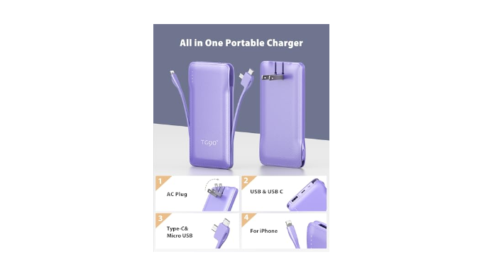 Portable Charger with Built-in AC Wall Plug and Cables:there is an ac wall plug and cables built-in the portable cell phone charger,allowing to recharge itself directly from the wall outlet and power your phone with the built-in cord No additional cables are required