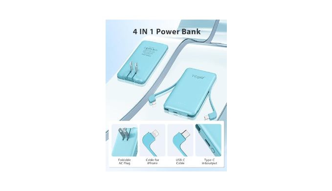 Power Bank with Built-in Foldable AC Wall Plug and Cables: This external battery pack with built-in Foldable AC Plug and cables allows it to charge the phone and recharge itself independently, getting rid of the bulky adapter and messy cables