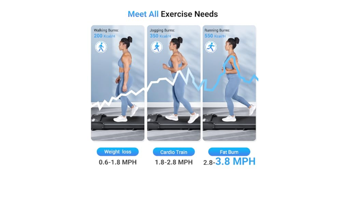 2 In 1 Under Desk Walking Pad Treadmill: There are 2 modes, it can be used as an under-desk treadmill when working and can be used as a walking pad when walking. 0.6-3.8 MPH Speed range allows you to walk or jog and also makes you customize your exercise intensity based on your physical condition and fitness goals