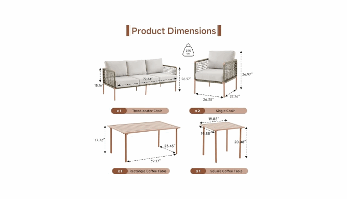 Versatile 5-piece patio furniture set: The outdoor wicker reception set includes 1 3-seater sofa, 2 single armchairs and 1 stylish rectangular coffee table, 1 square side table. This outdoor patio set is designed to provide an excellent seating experience, and the sturdy legs protect your floors and enhance stability. You can mix and match according to your needs to create the perfect outdoor setting for your patio, garden, sunroom, patio, backyard, porch, balcony or poolside.
