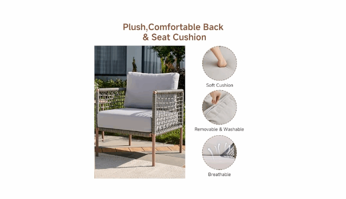 Easy to clean: The cushions of this patio reception set are made of high-density rebound 22D sponge, and the zipper closure allows us to quickly and easily remove the cushions, making replacement or cleaning a breeze. This outdoor reception set is modern and stylish, easy to maintain, and suitable for any size space.
