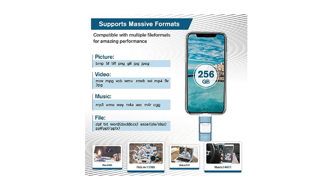 【photo stick Easy to Use】When you take beautiful photos on the go, store your favorite movies or TV programs from your computer on an flash drive and watch them anywhere and anytime. Also you can share document/photo to the social media directly from a USB storage device. (Facebook, Twitter, etc.) Memory stick 256GB you don\'t have to pay extra for additional storage, just insert it and enjoy the extra space of the device.