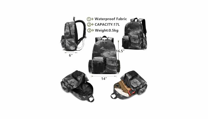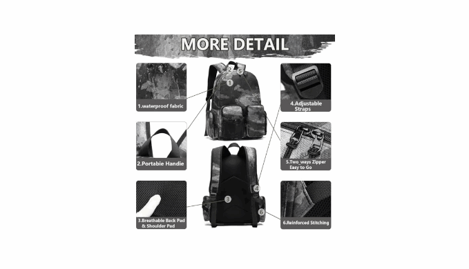 Tactical Smarts, Family-Friendly Flex: More than a backpack—Ideal for school ,traveling,hunting, hiking, fishing, camping, and military training.Discreet camo design keeps you hidden, while the sturdy build handles heavy loads (e.g,15-inch laptop folders and binders. Multiple pockets sort stationery, chargers, and snacks). Water-resistant coating fends off rain, and a hidden pocket locks up keys/phone. Tough enough for the trail, but built for the chaos (and joy) of his tiny hands grabbing gear.