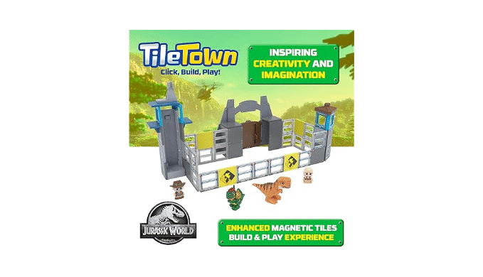 Tile Town Jurassic World Gate Escape Magnetic Tile Set: Transform your playroom into an epic adventure with our Dino Escape building dinosaur toys playset. This 84-piece magnetic dinosaur toys set - with 76 magnetic tiles, 3 action tiles, 5 figures, along with an instruction manual - encourages children to build sprawling Jurassic landscapes. Bring these landscapes to life by activating the magnetic play tiles of our playset – to capture Blue the Raptor character figure inside the cage on the truck while setting off the warning sign. Crafted from durable and safe materials, these tile magnets for kids inspire hands-on exploration of basic STEM principles—problem-solving, spatial reasoning, and creative storytelling—as kids design their own challenges and collaborate on rescue missions. The dinosaur building toy sparks endless narrative possibilities and deeper personal connections to play. Ideal for ages 3 and up, the Dino Escape magnetic tiles toy seamlessly blends imaginative fun with educational value, so every building session becomes a journey of discovery.