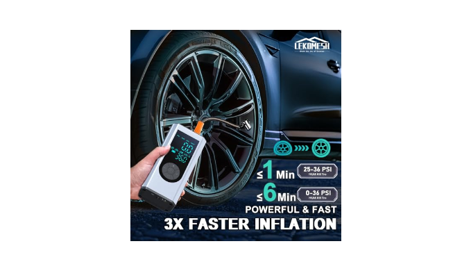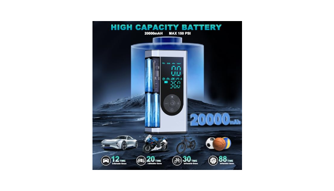 [3X FASTER TIRE INFLATION] The Air Compressor is built-in 20000mAH high capacity lithium battery (3 rechargeable batteries). Charging pressure up to 150PSI; from 0PSI to 36PSI only in 6minutes. This Air Pump can inflate 12 car tires/20 motorcycle tires/30 bicycle tires/88 basketballs under full charge. Strong range, can inflate multiple inflatable devices. Fast inflation speed, 3 times faster than ordinary inflators. Convenient for daily life and traveling.