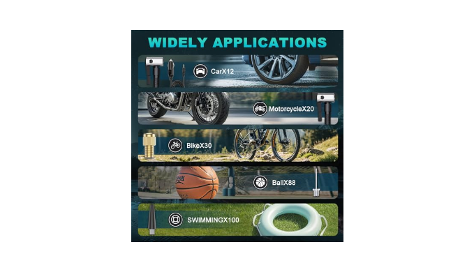 [MULTIFUNCTIONAL AIR PUMP] Our Portable Air Compressor mainly used to inflate car tires, motorcycle tires, battery car tires, bicycle tires, balls, inflatable beds, swimming rings and so on. This Tire Inflation can also be used for lighting first aid, with three flash modes: LED light, SOS light and flash light; it can also be used to charge cell phones and other electronic products.