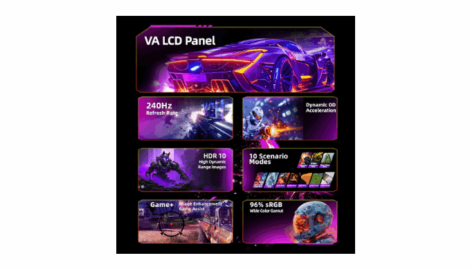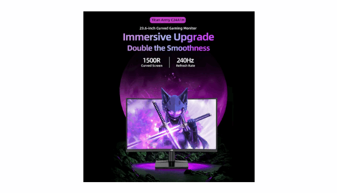 Boasting a 1500R curved design, the 23.6-inch Titan Army C24A1H gaming monitor delivers a focused and immersive viewing experience with vibrant colors, high contrast, and wide viewing angles, enhancing both multitasking efficiency and gameplay. It features an impressive 240Hz ultra-fast refresh rate and a 1ms MPRT response time, ensuring breathtaking clarity, fluid motion, and precise reaction to on-screen action. With a 1920×1080 FHD resolution and support for HDR10—including Auto-HDR, Gaming, and Movie modes—the monitor provides clear, vivid, and realistic visuals for gaming, movies, and work. The GAME+ function combines Picture Enhancement and Gaming Assistance, while 10 scenario modes—such as Standard, FPS, MOBA, Movie, and Eye Care—offer optimized settings for various activities. Additionally, the monitor reproduces rich colors with 96% sRGB coverage, 87% DCI-P3 color volume, 16.7 billion color depth, and a 3000:1 contrast ratio, all while incorporating low blue light technology to minimize eye strain during extended use.
