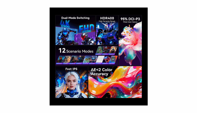 Experience the ultimate versatility with the TITAN ARMY P2712V gaming monitor, featuring one-click Dual Mode Switching that seamlessly transitions between 3840×2160@160Hz ultra-high definition and 1920×1080@320Hz high refresh rate modes to perfectly adapt to any gaming or content creation need. Its marvelous Fast IPS panel delivers significantly faster response times than standard IPS, dramatically improving motion clarity, reducing blur, and maintaining excellent image quality with vibrant colors and wide viewing angles—all while achieving a ΔE<2 color accuracy, 135% sRGB color volume, 95% DCI-P3 coverage, 8-bit+FRC color depth, and 1.07 billion display colors for stunning, true-to-life visuals. With HDR400 technology, it expands brightness and contrast for an immersive, cinema-like experience, and it includes integrated gaming assistance features for easy access to critical settings. Adaptive Sync synchronizes the refresh rate with your graphics card to eliminate screen tearing and stutter, while upgraded eye care technologies minimize flicker and blue light for comfort during long sessions. The monitor also offers 12 smart scenario modes for one-click optimization across different games and content, plus PIP/PBP functions for efficient multitasking and dual host display. Ergonomically designed, it supports tilting (-5° to 20°), pivoting, 100mm height adjustment, and 100x100mm VESA mounting, while built-in RGB gaming lighting enhances your setup and deepens your immersion in the game.