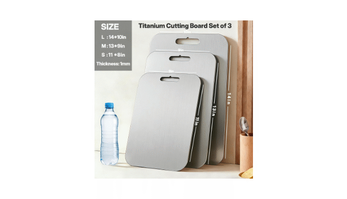 Titanium cutting boards for kitchen set of 3: 14\"L × 10\"W, 13\"L × 9\"W, and 11\"L × 8\"W, each crafted with a 1 mm thick pure titanium build. Different sizes meet various kitchen needs, making food prep easier and more efficient