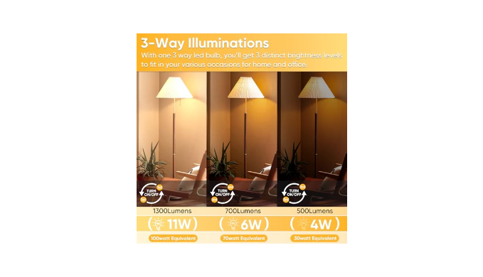 Energy-efficient 3 Way Light Bulbs: The 3-way bulbs offer 3 level brightness of 3000K soft white light, consume 4W/6W/11W power. They’re equal to 30/70/100watt incandescent bulbs which save 90%+ energy and being cost-saving alternatives for your old one