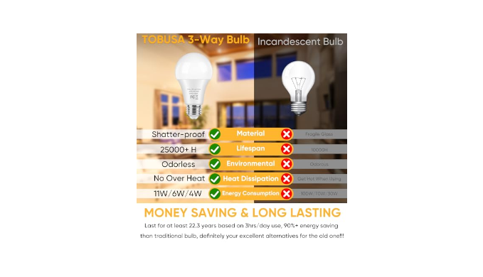 Long Lasting&Safe to Use: This 3 way led light bulbs are able to serve for you over 25000H which count 22.3 years(based on 3hrs/day)! They made with mercury-free, lead-free and shatterproof materials, rather environmental-friendly and safe to use