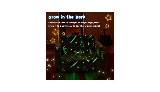 Toddler Sofa Glow in The Dark: The bright star pattern on the sofa can attract kids attention and stimulate their interest in the scientific universe,and fluorescent effect is also convenient for use and decor in low-light bedroom and dark environments. The bean bag chair can not only be used in kids furniture for playroom, nursery,day care,crèche, preschoo or early learning center, but can also be used as a sofa bed during rv travel, camping, and other family outdoor activities.