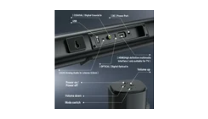 The soundbar is equipped with multiple audio output interfaces: USB/AUX/Coaxial/Optical/HDMI/Bluetooth. These enable easy connection to different types of devices, such as TVs, projectors, smartphones, and tablets, catering to various usage scenarios.