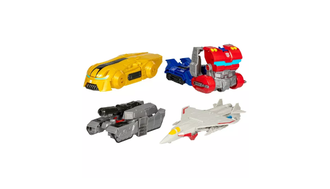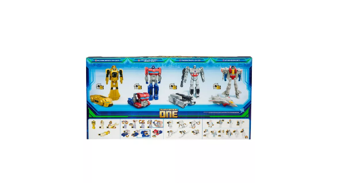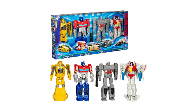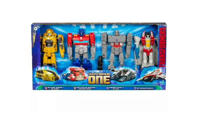 Experience the epic origins of legendary Transformers robots with this Transformers One Mega Changer 4-Pack! Each 11-inch (28 cm) action figure converts from robot to Cybertronian alt mode, just like in the movie. Optimus Prime/Orion Pax figure converts from robot to Cybertronian truck mode in 7 steps. Megatron/D-16 figure converts from robot to Cybertronian tank mode in 6 steps. Bumblebee/B-127 figure converts from robot to Cybertronian sports car mode in 3 steps. Starscream figure converts from robot to Cybertronian jet mode in 6 steps. The simple conversions make these Transformers figures a great gift for 6 year olds and up! The figures are inspired by the iconic characters from the Transformers movie, Transformers One, which tells the origin story of Optimus Prime and Megatron, once friends bonded like brothers, who changed the fate of Cybertron forever.