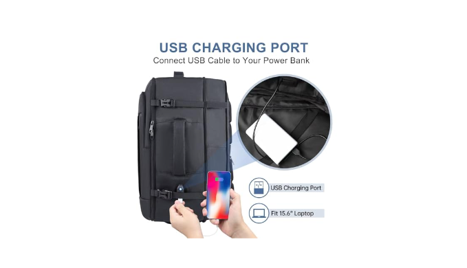 Usb Charging Port: The travel backpack features a built-in USB charger outside and a charging cable inside, providing a convenient way to charge your phone while walking. It is important to note that the backpack does not include a power bank and does not power itself. The USB charging port is designed solely for charging purposes. With this added convenience, the backpack offers a practical solution for people who are frequently on-the-go and need to keep their electronic devices charged.