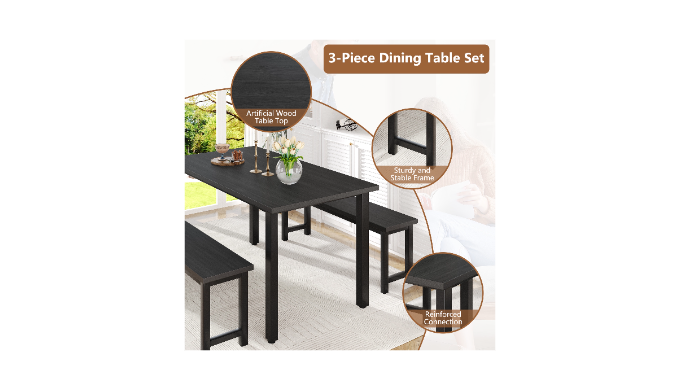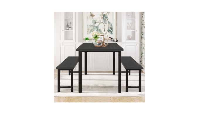 This handsome, functional Three Piece Dining Set includes one dining table and two benches. The uhomepro 3 Piece Dining Set Table and Two Benches modern style seats four and is perfect for both open eat-in kitchens or cozy dining rooms.